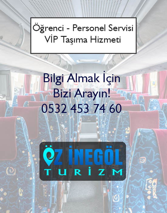 Öz İnegöl Turizm olarak 25 yıldır müşterilerimiz için güvenlik ve konforu en ön planda tutarak Öğrenci Servisi, Personel Taşımacılığı ve VİP transfer hizmeti veriyoruz. Seyahatlerinizde bizi tercih etmek ve fiyat almak için 0532 453 74 60 numaramızdan bize ulaşabilirsiniz.